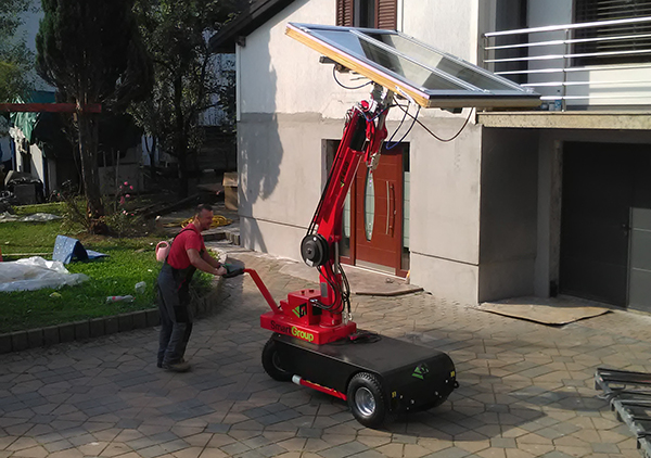 Even across rugged terrain, like other SG Lifts, it can easily pick up a sheet of glass off a glass truck, A-frame, or out of a glass crate and then carry the glass safely to complete an installation. Its foam-filled tires will not deflate if punctured by nails or screws and its 21-inch wide rear-wheel base provides greater stability on the rough surfaces at construction sites. Its dual vacuum suction cup system safeguards the handling of glass while transporting and installing it.